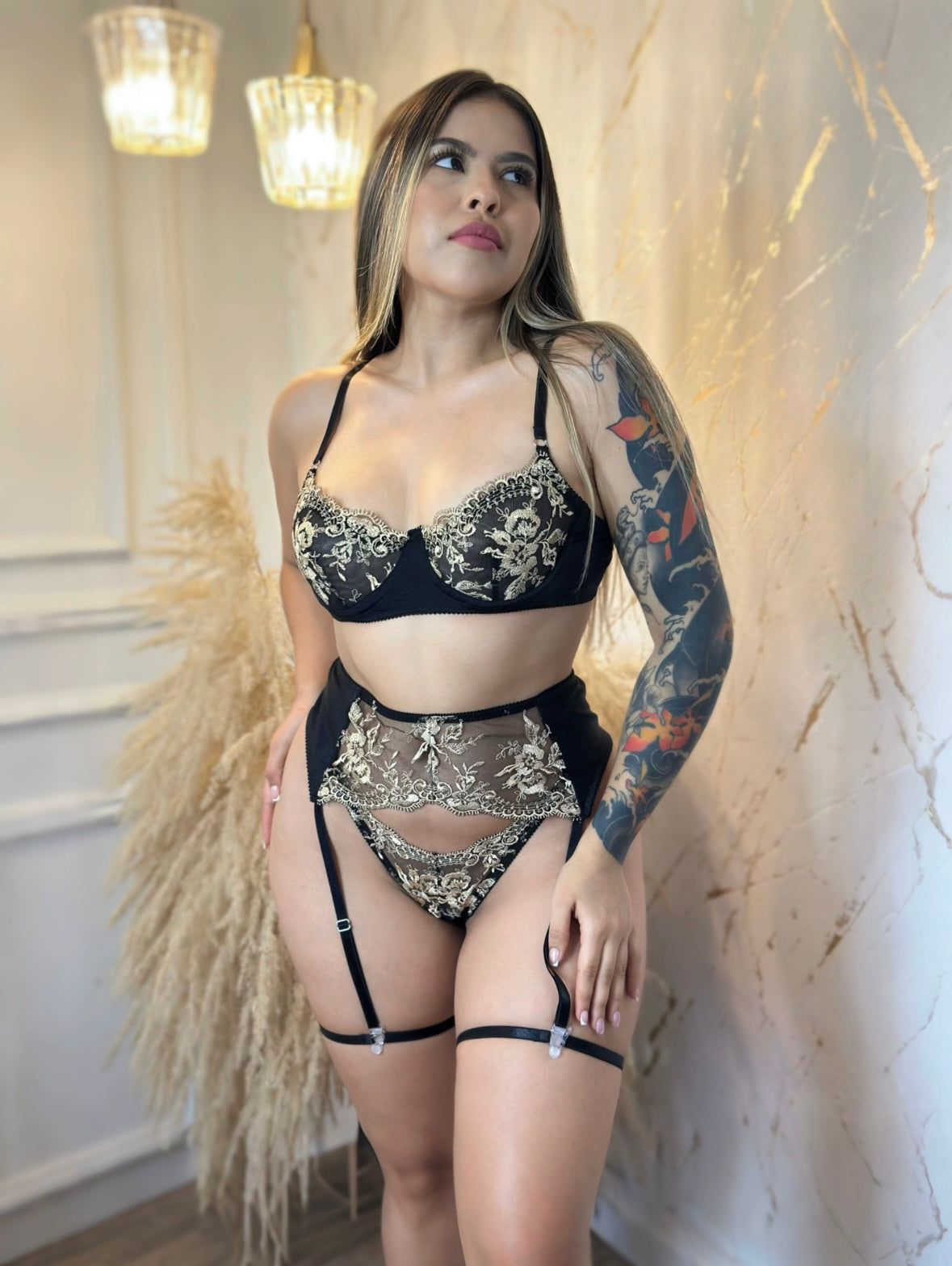 El Set Golden Alta costura combina la delicadeza del tul con bordados dorados PREMIUM que parecen pintados a mano sobre la piel.✨ Brassier de encaje con soporte suave, braga tipo tanga, liguero estiliza y realza sin esfuerzo, detalles florales y las transparencias.